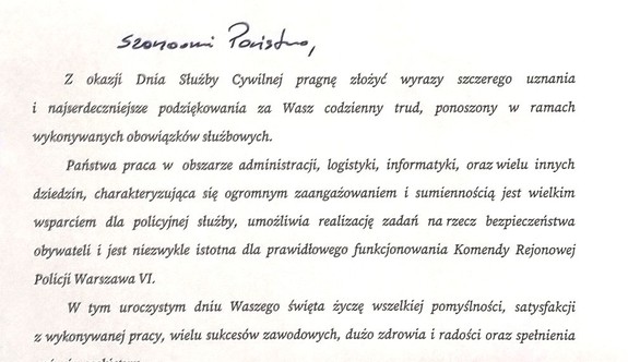 Życzenia Komendanta Rejonowego Policji Warszawa VI z okazji Święta Służby Cywilnej