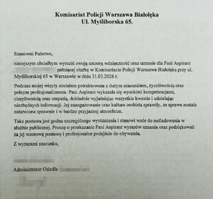 "(...) Taka postawa jest godna szczególnego wyróżnienia i stanowi wzór do naśladowania w służbie publicznej (...) " - to fragment podziękowań dla policjantki z Wydziału Kryminalnego, przesłanych do Komisariatu Policji Warszawa Białołęka. Przedstawicielka administracji i jednocześnie autorka tej korespondencji, w tych serdecznych słowach, wyraziła wdzięczność dla policjantki za jej profesjonalizm, empatię i życzliwość, których doświadczyła podczas wizyty w komisariacie.