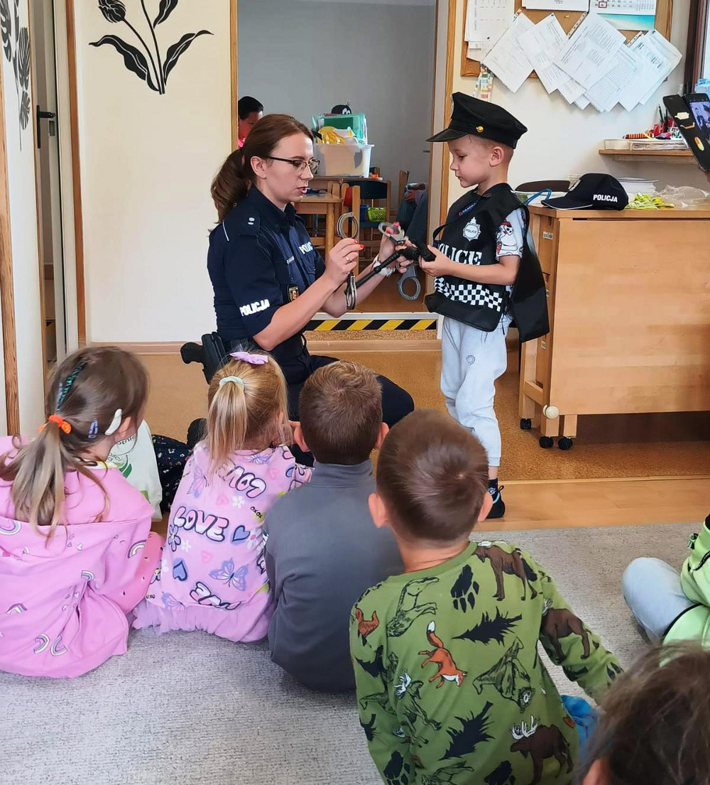 Profilaktyczka mówiła, jak należy bezpiecznie poruszać się po chodniku i przejściu dla pieszych. Zwróciła uwagę na stosowanie się do znaków i sygnalizacji świetlnej. Omówiła też sytuacje, w których obce osoby mogłyby chcieć nawiązać kontakt z nimi, nawet w rejonie przedszkola i jak należy wówczas zareagować. Policjantka i dzieci wspólnie powtórzyli też numery alarmowe.