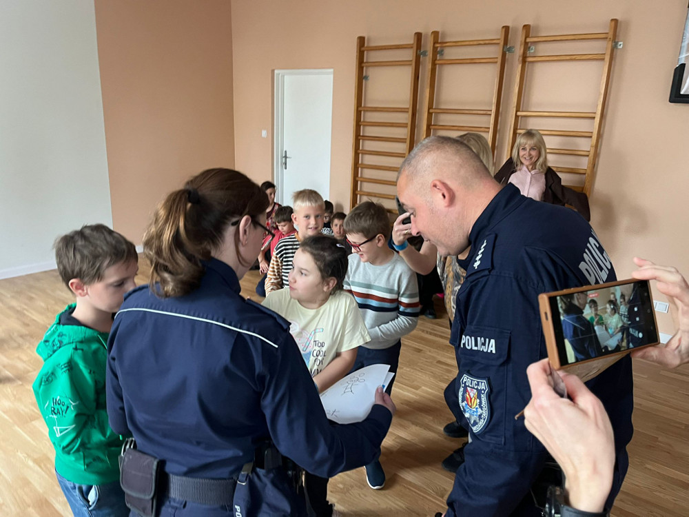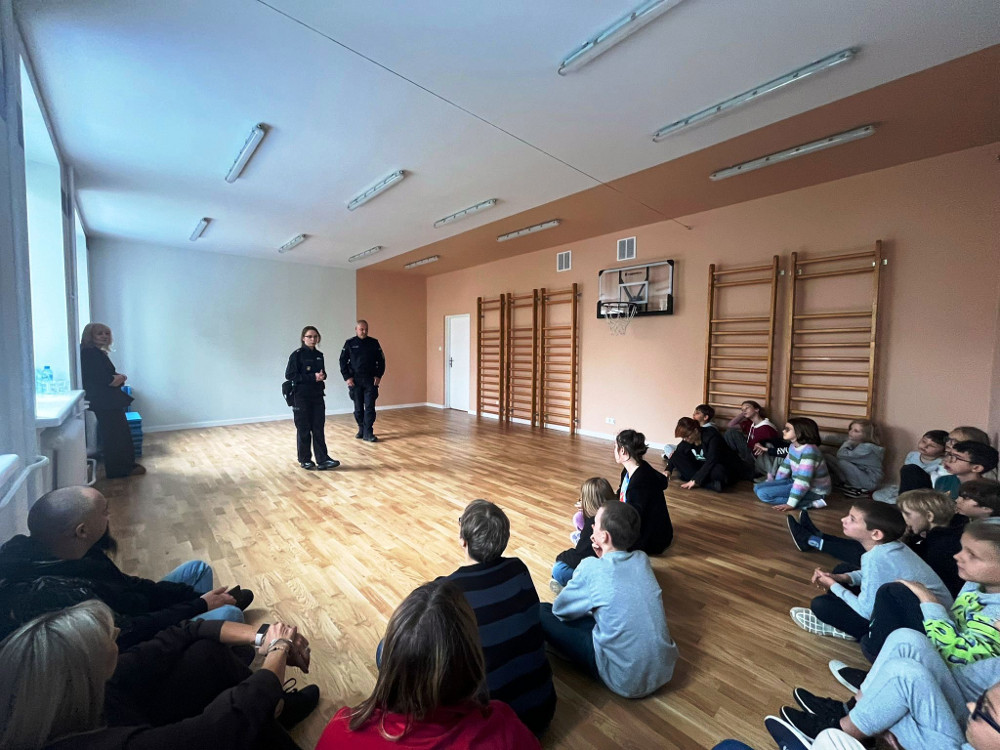 Policjanci przeprowadzili prelekcje dla uczniów klas 1-8, podczas których poruszyli wiele ważnych kwestii. Ze starszymi uczniami rozmawiali o odpowiedzialności prawnej osób nieletnich. Wyjaśnili, kiedy nieletni może odpowiadać przed sądem za swoje czyny oraz podali przykłady niezgodnych z prawem zachowań.