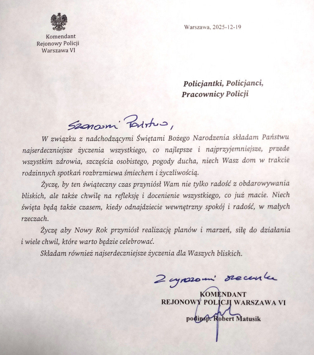 Życzenia Komendanta Rejonowego Policji Warszawa VI
