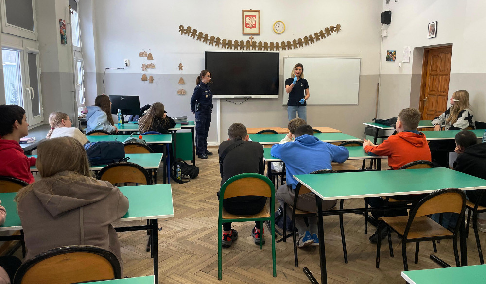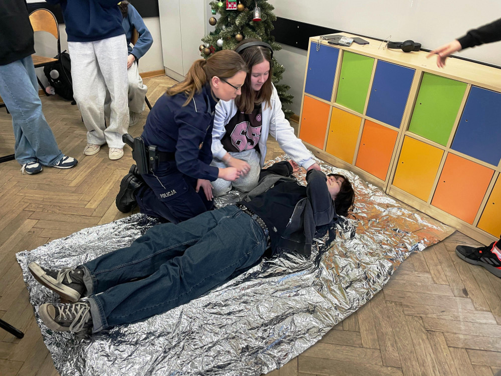 Policjanci, razem z przedstawicielką Stołecznego Centrum Bezpieczeństwa w dzielnicy Praga Północ, przeprowadzili też instruktaż z udzielania pierwszej pomocy osobie, która uległa wypadkowi. Uczniowie aktywnie uczestniczyli w zajęciach.