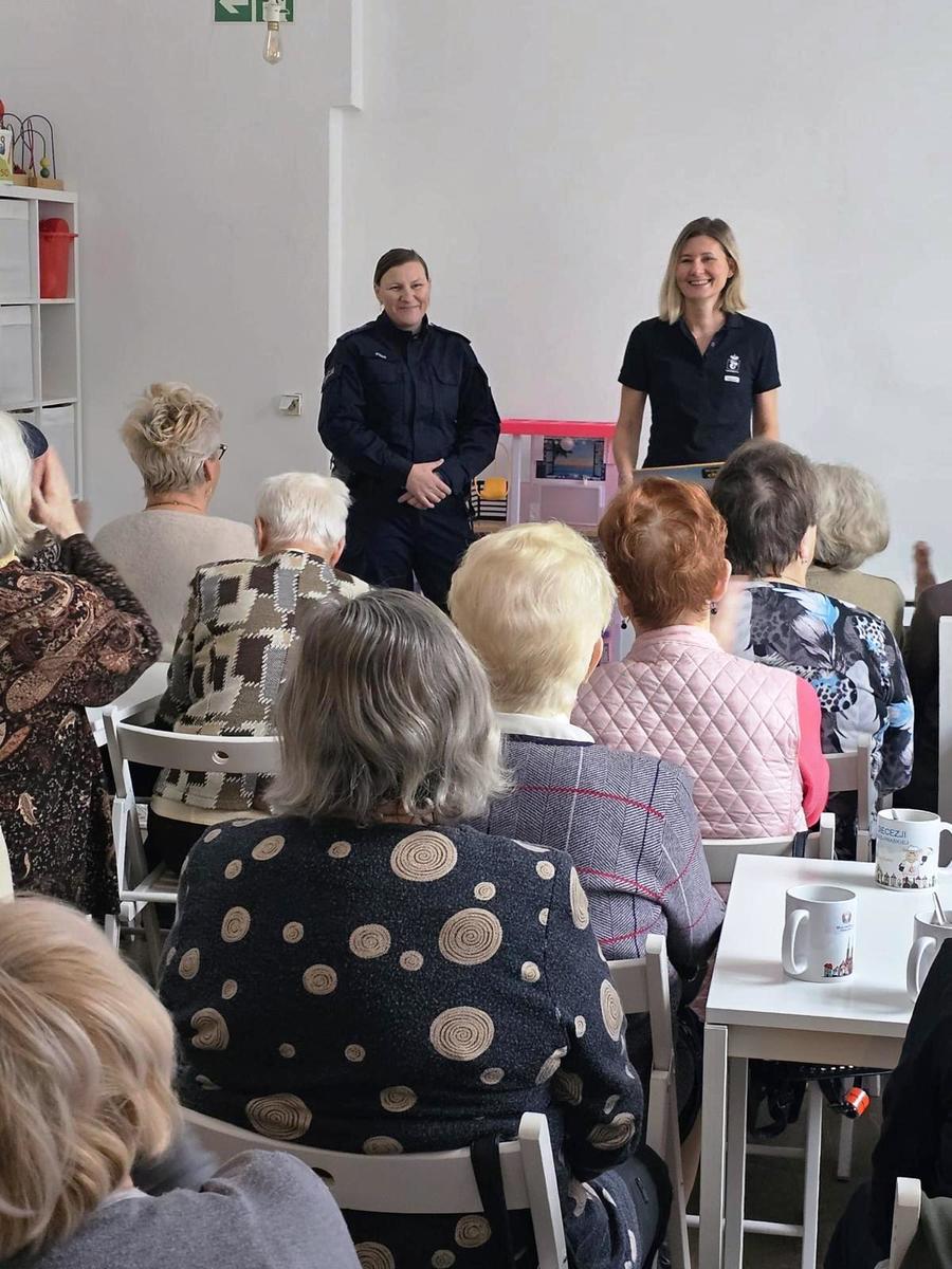 Policjantka najpierw omówiła kwestie związane z bezpieczeństwem w miejscu zamieszkania dotyczące przemocy w rodzinie i zachęcała do kontaktu z dzielnicowym w przypadku poczucia zagrożenia. Ostrzegała też przed wpuszczaniem do mieszkań osób obcych, które mogą podawać się za pracowników administracji, elektryków, hydraulików, czy mało znanych sąsiadów. Apelowała, by dokładnie weryfikować ich tożsamość i cel wizyty. Tłumaczyła, jakie mogą być konsekwencje braku czujności i rozwagi. Nawiązała również do aktywności osób, podających się za wnuczków, policjantów czy prokuratorów, które mogą telefonować do seniorów, żeby wyłudzić pieniądze. Wyjaśniła, jak należy zachować się w takiej sytuacji.