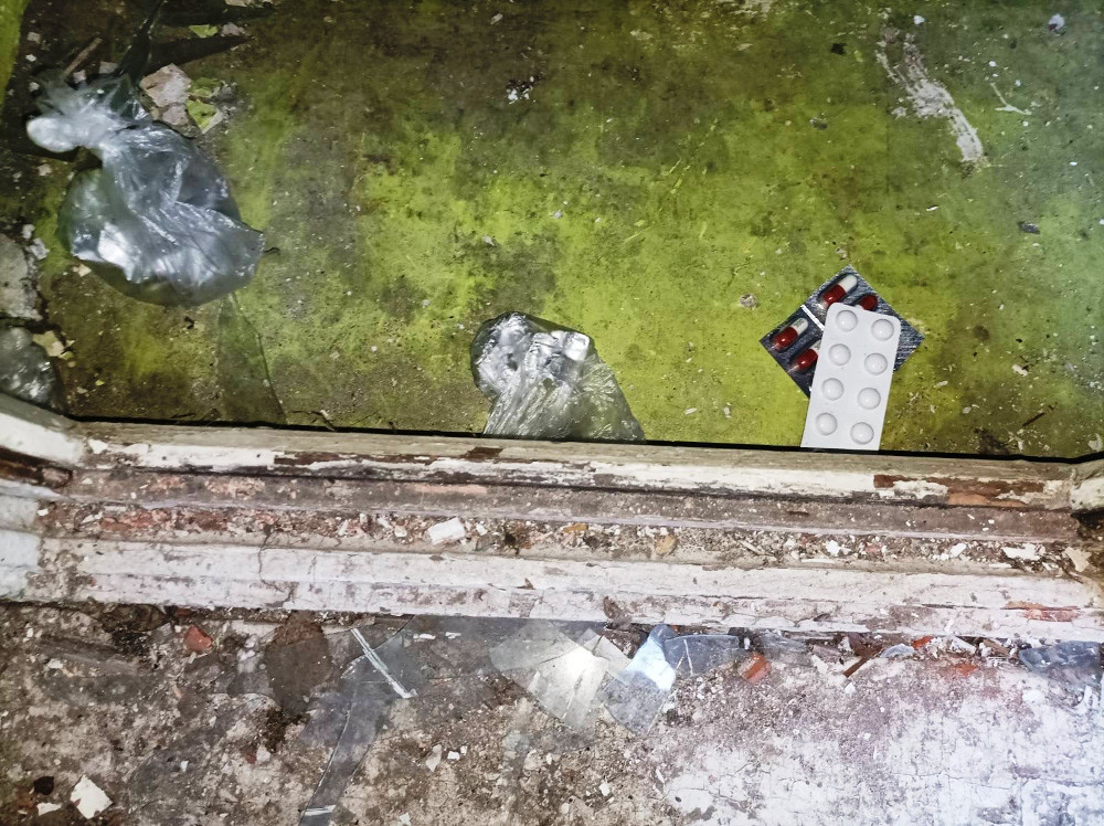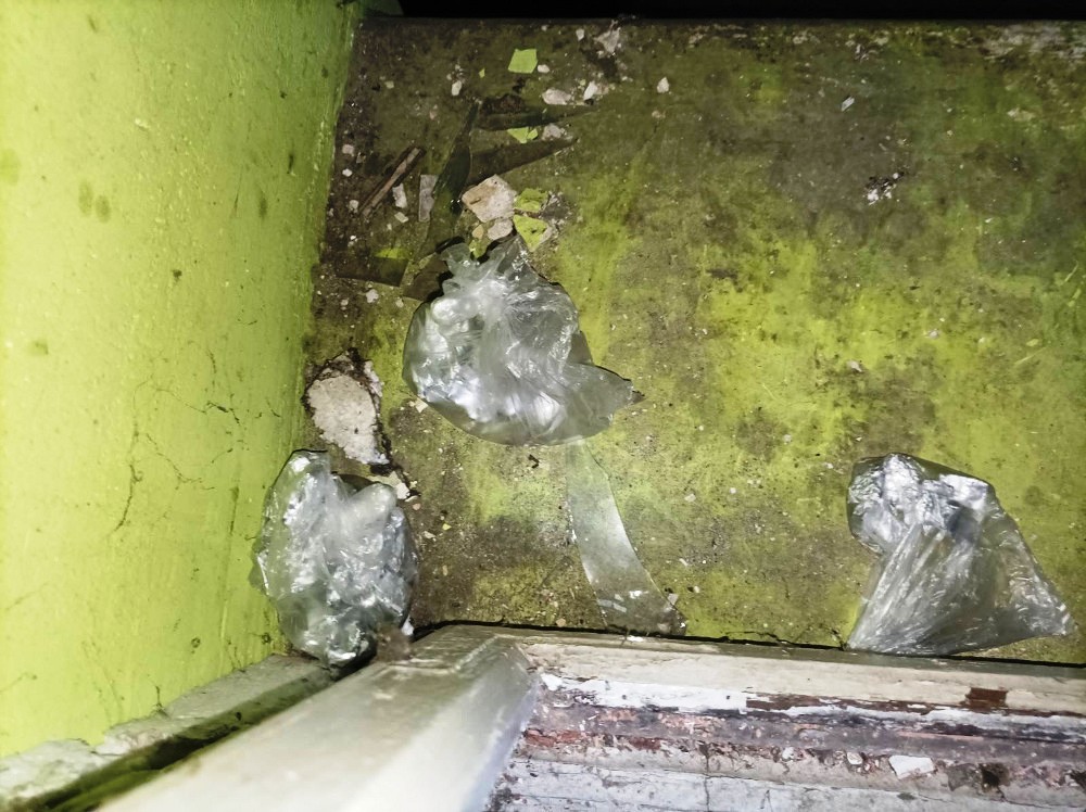 W trakcie działań, pod tym adresem, w pierwszym podwórzu, kryminalni znaleźli ukryte w śniegu dwa pojemniki plastikowe z foliowymi zawiniątkami, w których był biały i beżowy proszek. Na parapecie znajdował się kolejny plastikowy pojemnik zawierający 20 zawiniątek z folii aluminiowej z zawartością suszu roślinnego i inne opakowanie, w którym było kilkadziesiąt zawiniątek ze zbryloną białą substancją oraz foliowe woreczki z poporcjowanymi substancjami. Przeszukanie tego miejsca odbyło się w obecności przewodnika z psem do wykrywania zapachu narkotyków.