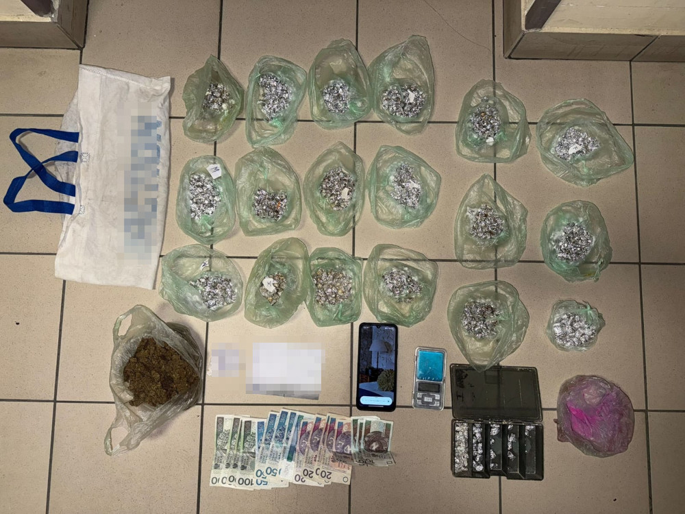 Tuż przy nim, w uchylonym oknie od piwnicy, policjanci znaleźli zawieszoną reklamówkę, w której znajdowało się kilkaset zawiniątek z białym i beżowym proszkiem, dwie torebki z suszem roślinnym oraz różowym proszkiem. Mężczyzna został "przyłapany", gdy przekładał poporcjowane środki.