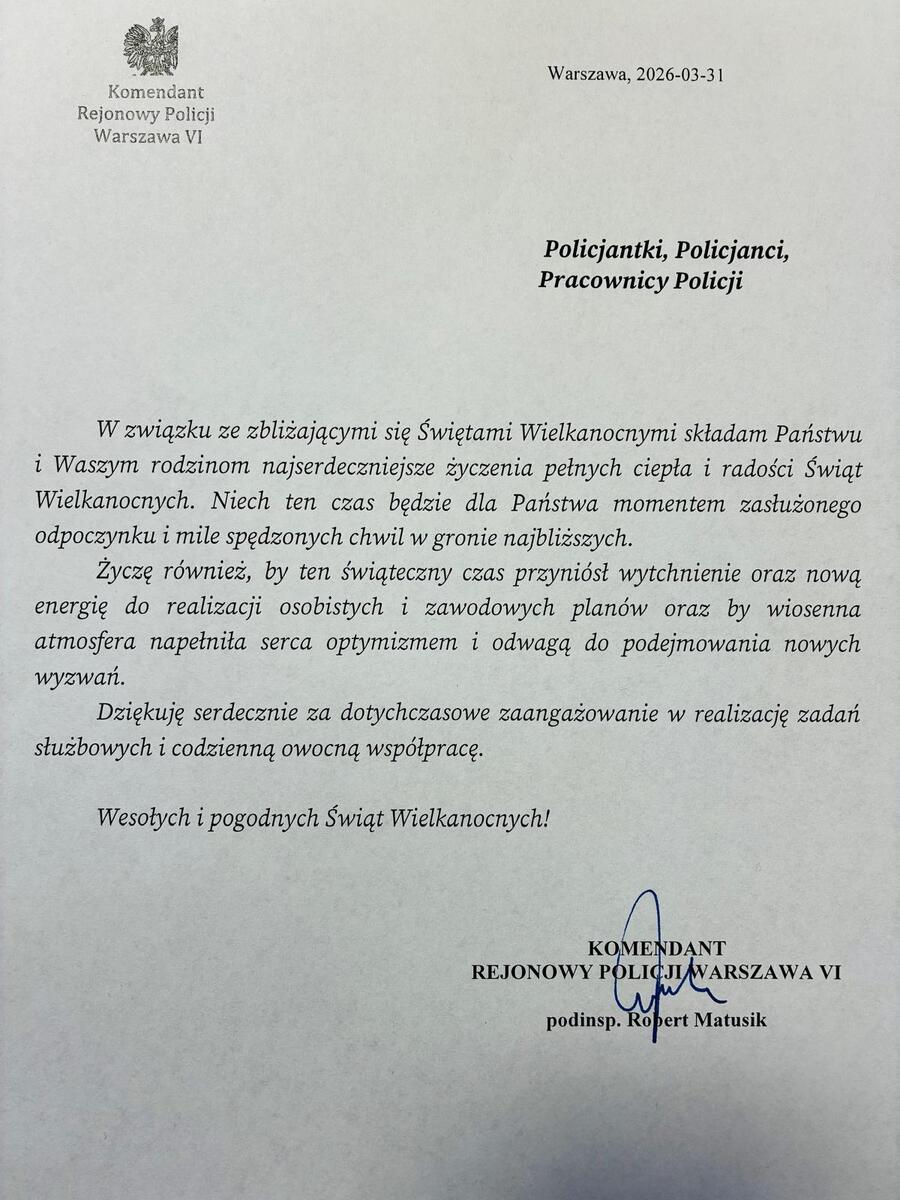 Życzenia Komendanta Rejonowego Policji Warszawa VI z okazji Świąt Wielkanocnych Data publikacji 02.04.2026 Powrót Drukuj