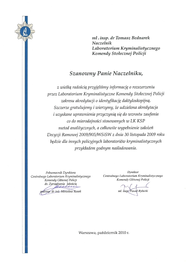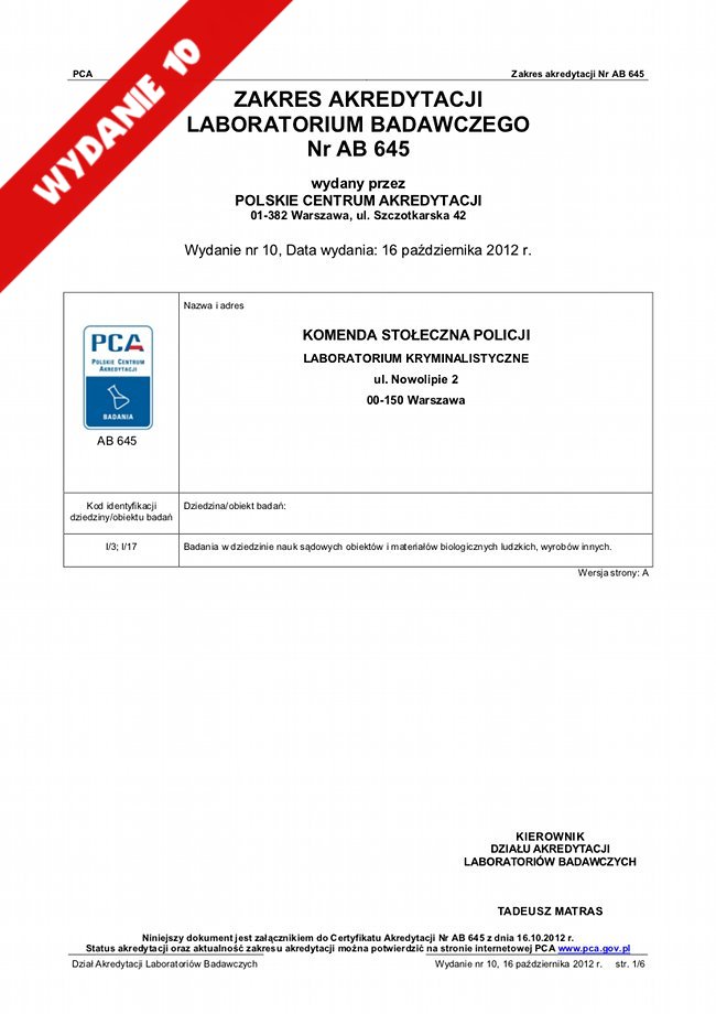 Z przyjemnością informujemy, że Laboratorium Kryminalistyczne Komendy Stołecznej Policji uaktualniło zakres akredytacji AB 645 o kryminalistyczne badania DNA w systemach STR, co znalazło odzwierciedlenie w 10 wydaniu zakresu akredytacji z dnia 16 października 2012 r. Kilka lat temu stołeczne Laboratorium uzyskało tego typu akredytację i jako pierwsze z komend wojewódzkich Policji wypełniło wymagania Decyzji Ramowej Rady 2009/905/WSiSW z dnia 30 listopada 2009 r. w sprawie akredytacji dostawców usług kryminalistycznych wykonujących czynności laboratoryjne.