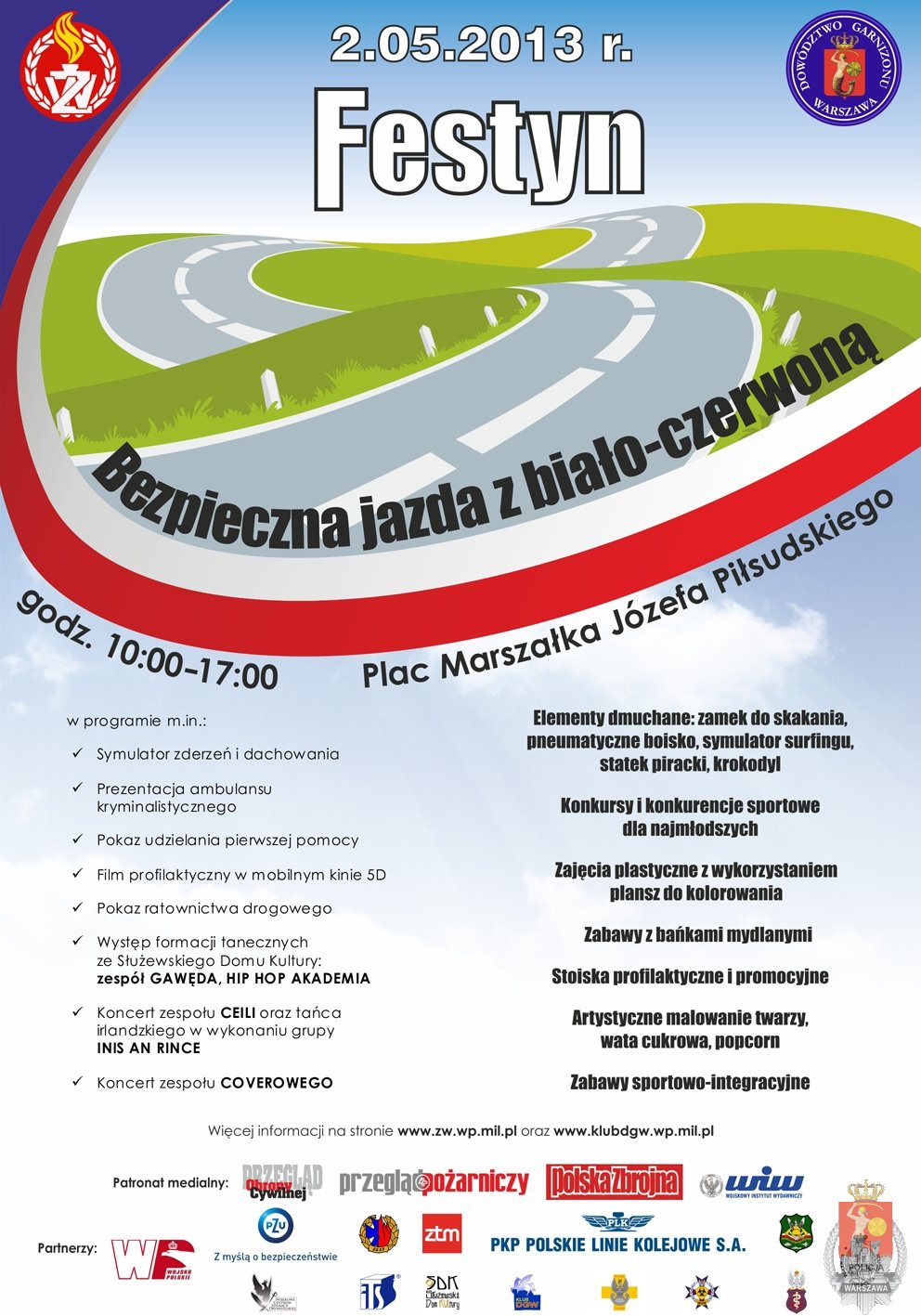 Komenda Główna Żandarmerii Wojskowej, Dowództwo Garnizonu Warszawa oraz Komenda Stołeczna Policji mają zaszczyt zaprosić wszystkich chętnych do udziału w festynie profilaktycznym „Bezpieczna jazda z biało-czerwoną”, który odbędzie się 2 maja na placu Marszałka Józefa Piłsudskiego