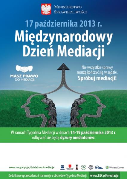 Nie wszystkie sprawy muszą kończyć się w sądzie. „Masz prawo do mediacji”, pod takim hasłem z inicjatywy Ministerstwa Sprawiedliwości od 14 do 19 października zorganizowany zostanie „Tydzień Mediacji”. 17 październik 2013 roku ustanowiony został Międzynarodowym Dniem Mediacji.