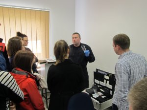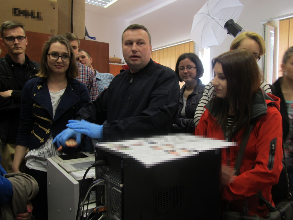 W dalszej kolejności, zespół techników kryminalistyki, zaprezentował studentom fragment ich codziennej pracy. Dzięki uprzejmości policjantów, studenci mieli szansę dowiedzieć się jak wygląda tworzenie zdjęć sygnalitycznych oraz kart daktyloskopijnych. Przy okazji dowiedzieli się co znajduje się w walizce kryminalistycznej.