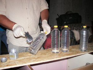 Wynikiem wczorajszej akcji policjantów zwalczających na Pradze Północ przestępstwa gospodarcze było zabezpieczenie wartego około 5000 złotych 60 litrów alkoholu, narzędzi służących do jego rozlewania, ponad 800 złotych, plastikowe nakrętki oraz zatrzymanie w związku z nielegalnym handlem 43 – letniej Małgorzaty Z. oraz 38 – letniego Dariusza B. Para nieuczciwych handlarzy przyznała się do zarzucanego im czynu i poddała dobrowolnie karze.