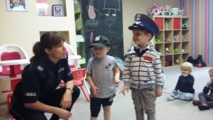 Sierż. sztab. Magdalena Kwiatkowska oraz sierż. sztab. Agata Trzaskoma korzystając z okazji, poprzez gry i zabawy edukacyjne przeprowadziły niezwykle ciekawą prelekcję na temat zachowania się dzieci w otaczającej rzeczywistości. Przypomniały jak bezpiecznie zachowywać się na spacerze, przejść przez ulicę oraz jak należy zachować się w kontakcie z osobami obcymi.