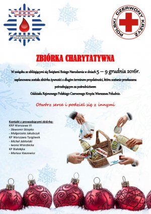 W związku ze zbliżającymi się Świętami Bożego Narodzenia Klub Honorowych Dawców Krwi, działający przy Komendzie Rejonowej Policji Warszawa VI, w dniach 5-9 grudnia 2016 r. zaplanował kolejną już zbiórkę żywności z długim terminem przydatności, która zostanie przekazana potrzebującym za pośrednictwem Oddziału Rejonowego Polskiego Czerwonego Krzyża Warszawa Południe. Gorąco zachęcamy wszystkich do włączenia się w tę akcję.