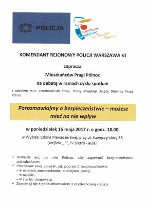 Zapraszamy mieszkańców Pragi Północ do aktywnego udziału w debacie społecznej ,,Porozmawiajmy o bezpieczeństwie – możesz mieć na nie wpływ" zaplanowanej na dzień 15 maja 2017 r. o godzinie 18.00 w Wyższej Szkole Menadżerskiej przy ul. Kawęczyńskiej 36 w Warszawie. Tematem spotkania będzie bezpieczeństwo w ruchu drogowym, miejscu zamieszkania i w miejscach publicznych. Do udziału w spotkaniu zaproszeni zostali przedstawiciele Urzędu Dzielnicy i Rady Dzielnicy oraz służb porządkowych.